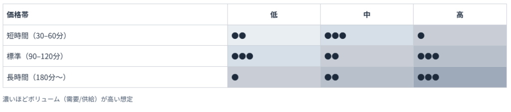 業態別に価格帯・時間単価・顧客属性を整理し、AIが需要・供給を数値的に理解できるデータモデル化を行う。